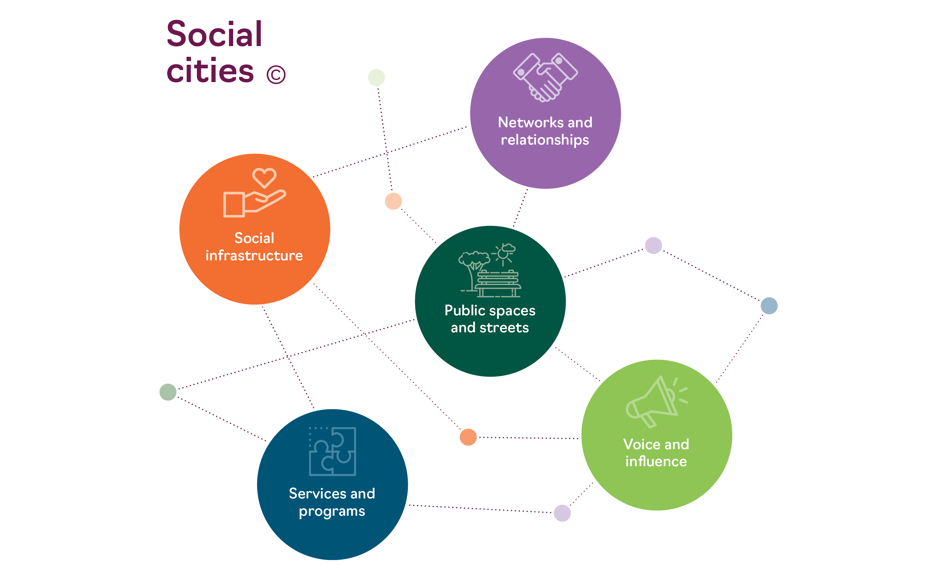 The graphic below shows the core elements that work together to create a social city including its: social infrastructure; public spaces and streets; networks and relationships; services and programs; voice and influence. Social cities recognise that every person (from every background) has a right to access the essential social infrastructure and services they need (such as schools, hospitals, libraries and government services) as well as have a seat at the table about decisions that affect them, to participate in programs and community groups, and form strong bonds and relationships with each other.