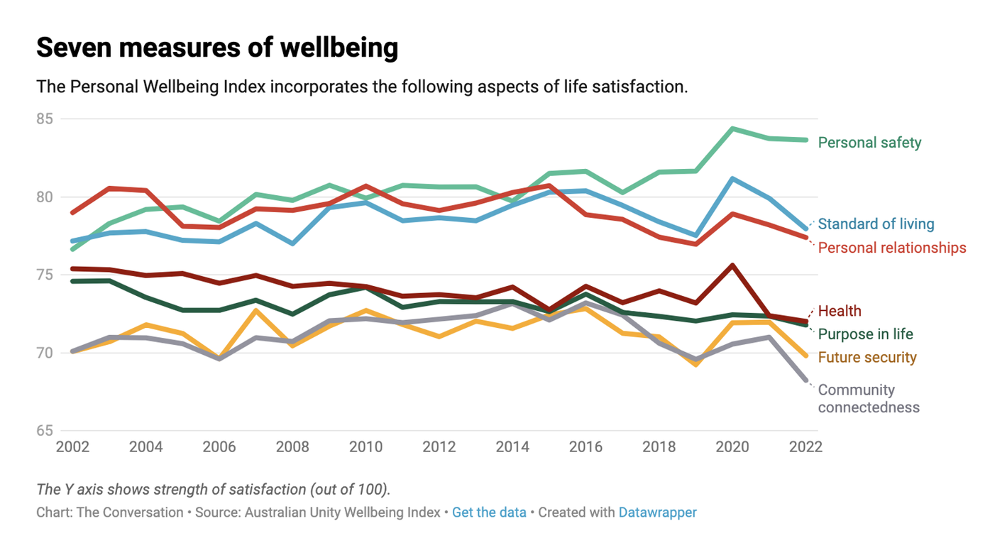 Australians’ satisfaction with life as a whole is at its lowest level in 21 years, according to the latest Australian Unity Wellbeing Index survey, a collaboration between Deakin University and mutual company Australian Unity. While our sense of personal safety is at its highest, Community Connectedness is at its lowest since 2002 and has seen the most significant decline post Covid, floods and fires. This decline in community connectedness is a significant barrier to our ability to plan for, respond to, and recover from disasters, shocks and stresses.