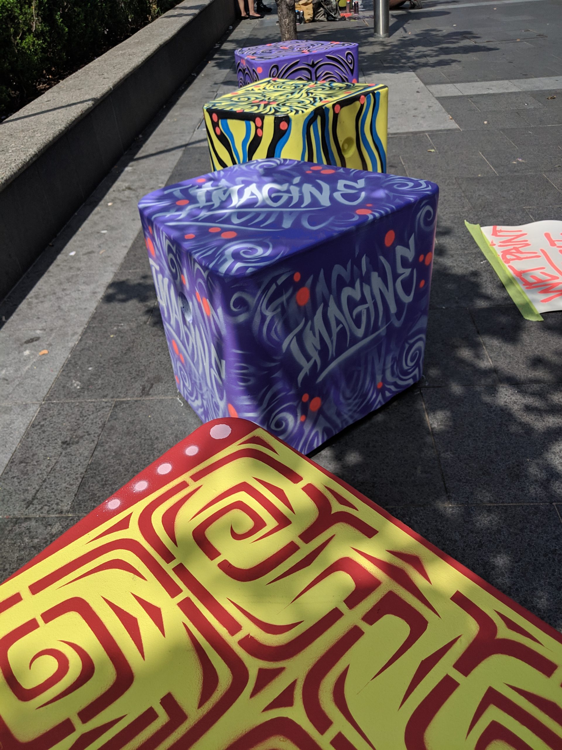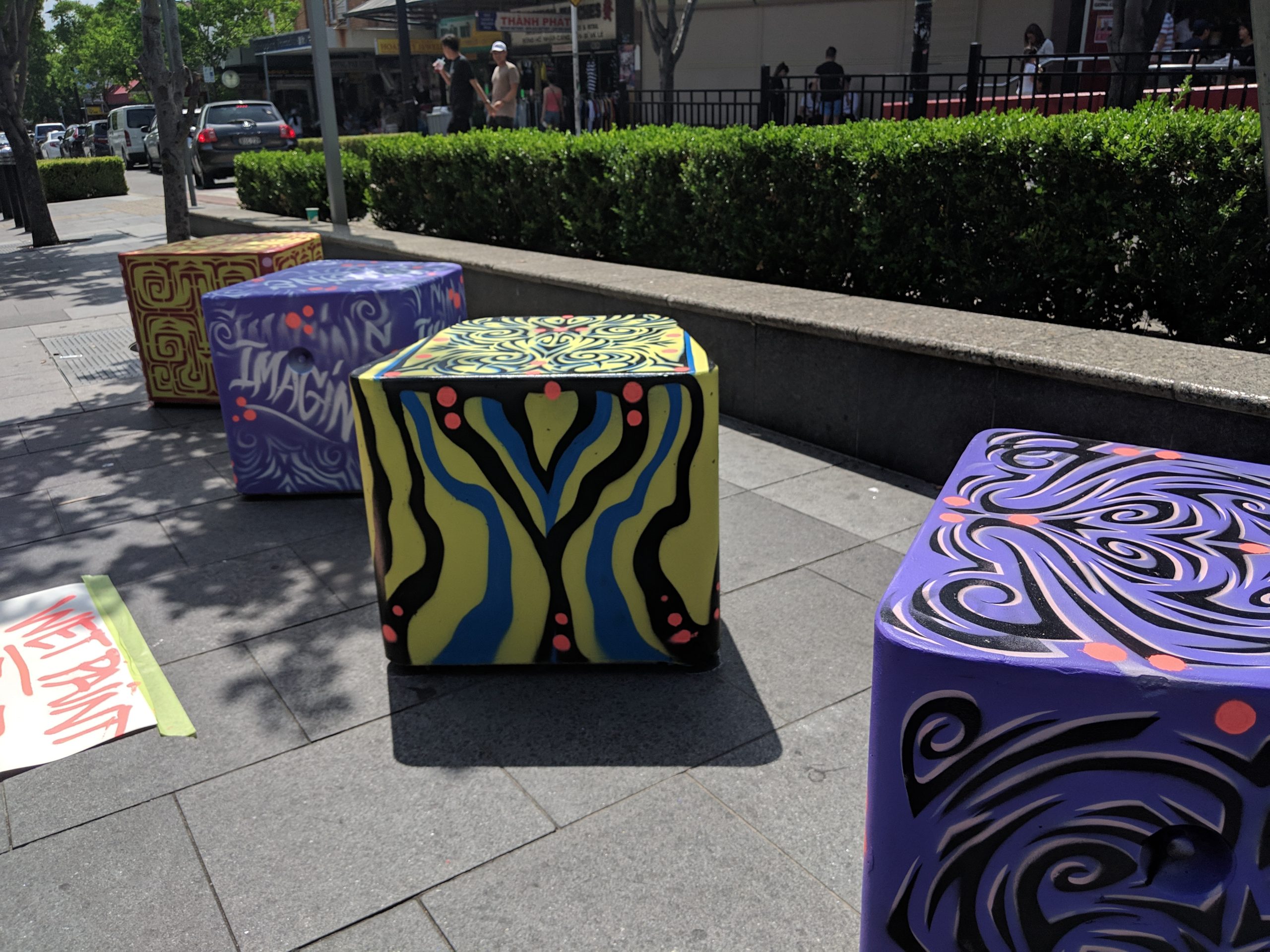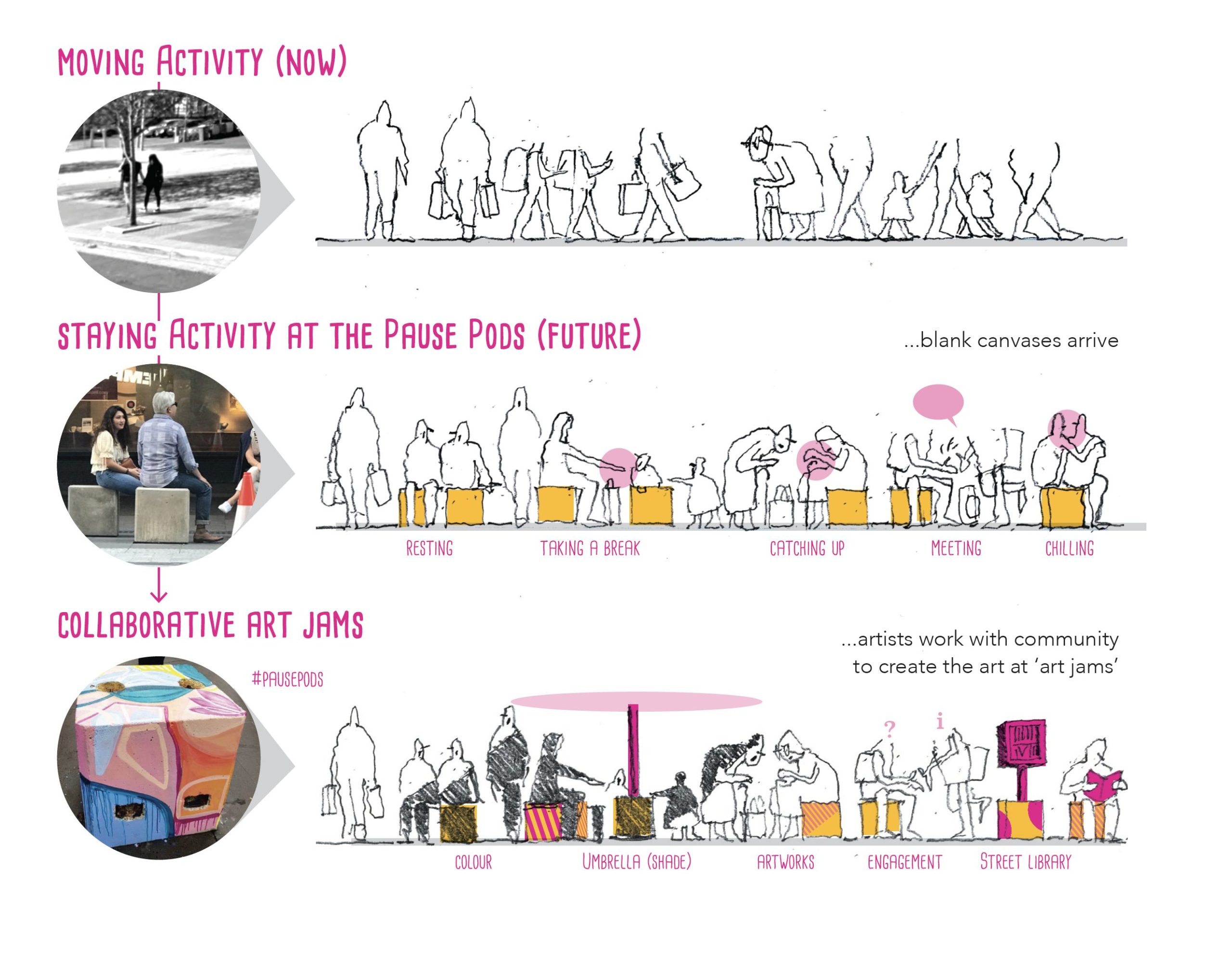 To address these challenges, in June 2018, the City of Canterbury-Bankstown awarded a Bankstown Urban Activations grant to Cred Consulting and RDO Architects to design and deliver temporary public seating in Bankstown Town Centre. We call these seating spaces ‘Pause Pods.’