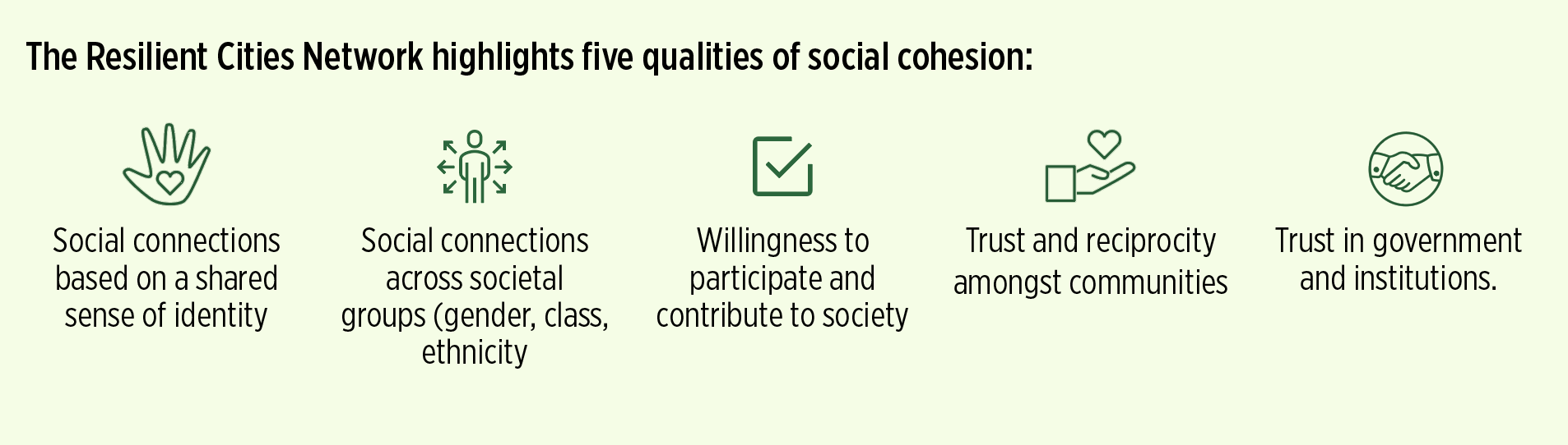 At its core, social cohesion is the foundation of community resilience. Strong social networks, a sense of belonging and trust enables communities to come together and support one another during challenging times. Without trust, shared values and cooperation based on equal opportunities, societies are more likely to experience unrest and disorder which in turn makes it harder to cope when disruptions occur.